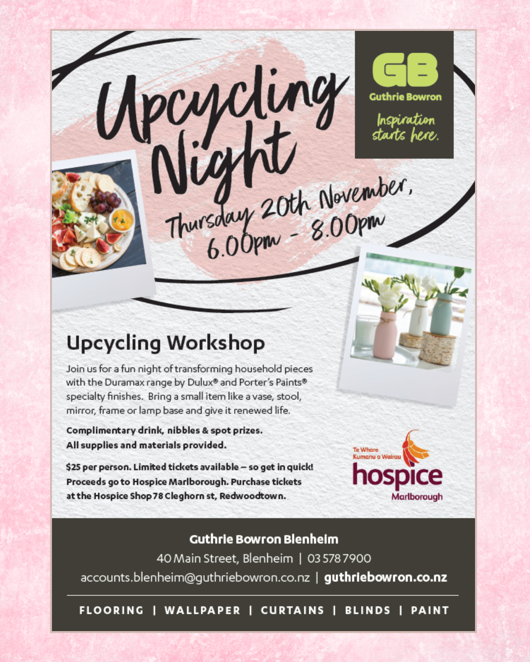 A creative evening at Guthrie Bowron Blenheim learning how to transform everyday household pieces into something new and beautiful Bring along a small item (like a vase, mirror, stool, or…